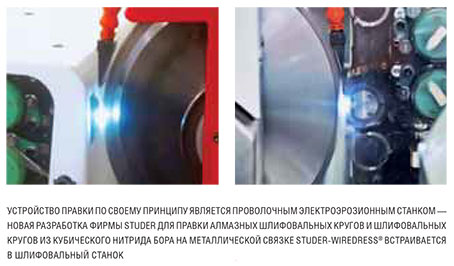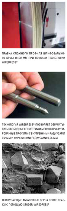 | Разработка и внедрение фирмой Studer электроэрозионной технологии правки WireDress® открывает новые возможности шлифования кругами на металлической связке и значительно экономит вспомогательное время. Производительность шлифования увеличивается на 30% по сравнению с использованием шлифовальных кругов на керамической связке или на связке из искусственной смолы. Износ шлифовальных кругов уменьшается на 70%. Можно править шлифовальные круги с очень точными тонкоструктурными профилями.